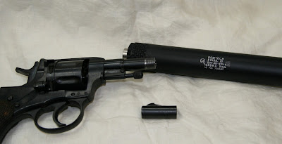 Congratulations to commenter "global village idiot" for his correct guess on Friday's Mystery Picture. I was loitering at Coal Creek Armory when Shannon came back to gunsmithing with a Nagant revolver that someone wanted threaded for a can, and wondered if we thought it would be cool if he also threaded the end of the barrel with the front sight to serve as a thread protector.